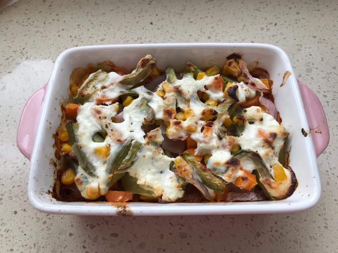 蛋奶素 稍微改动了一下方子 自己做的披萨酱和伪奶酪 披萨底水多了所以成了烩土豆泥 但是超级好吃啊!