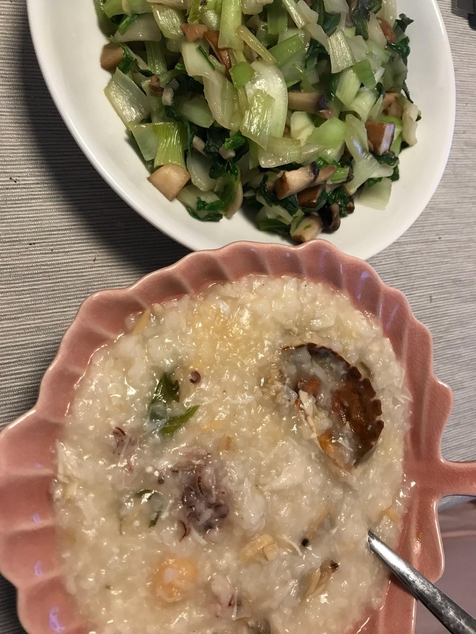 海鲜粥+蘑菇炒油菜