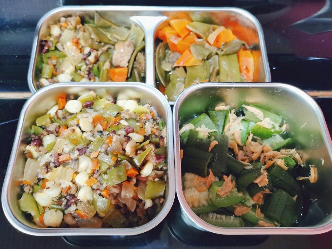 尖椒肉末雜蔬炒玉米杂粮饭,虾皮蒸丝瓜,牛肉炖胡萝卜豆角