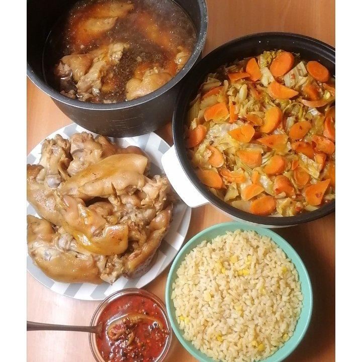 五香卤猪蹄,红油辣子,高汤炖胡萝卜卷心菜,