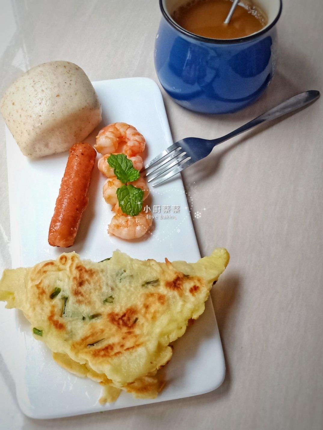 今日早餐:奶香全麦馒头,虾,脆皮肠,...