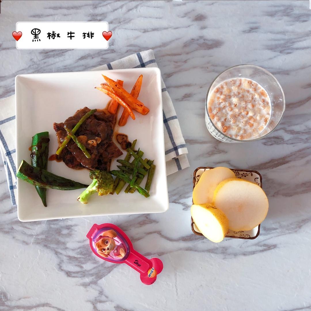 黑椒牛排,燕麦牛奶,棒棒奶酪,烟台梨