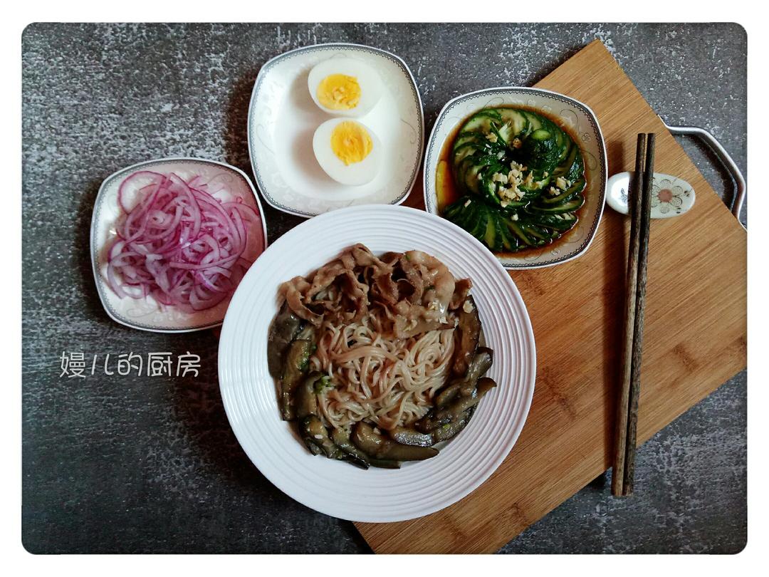 今日早餐:茄子五花肉焖面,拌洋葱,白水蛋,蓑衣黄瓜