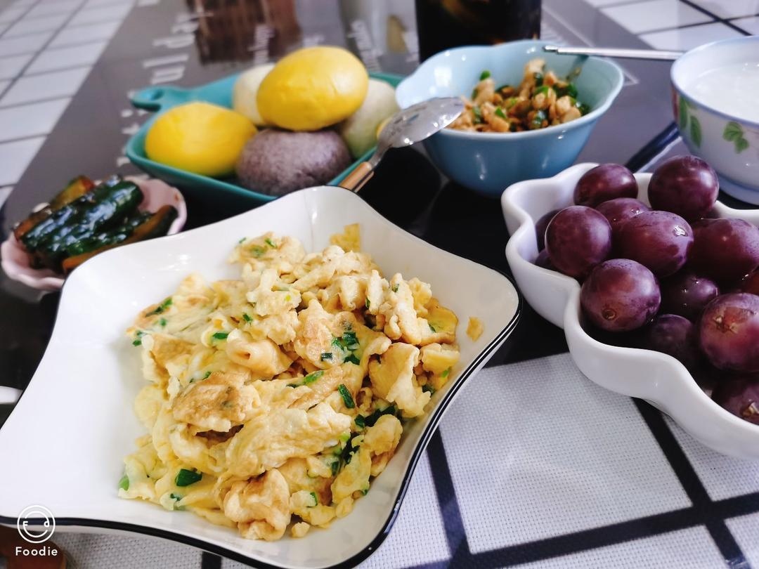 今日早餐记:香葱油酥烧饼,五谷豆浆,麻辣土豆丝,葡萄🍇,猕猴桃🥝