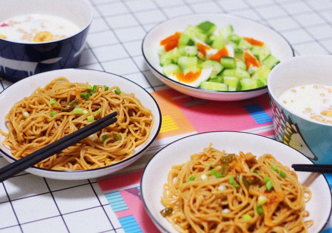 热干面,麦片泡个奶,黄瓜拌个鸡蛋~