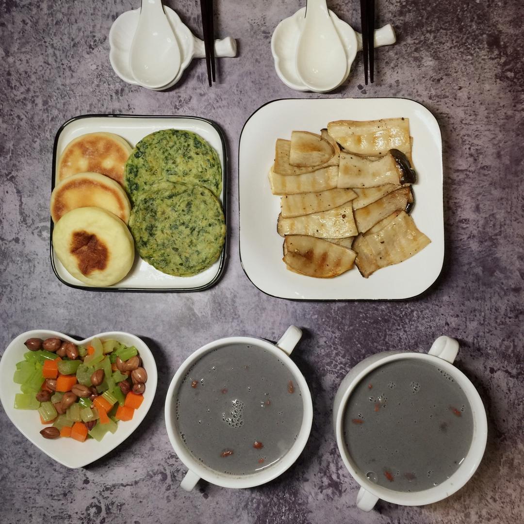 煎杏鲍菇+黑豆黑芝麻黑米牛奶燕麦米糊+拌芹菜胡萝卜花生+山药饼+芹菜叶鸡蛋饼