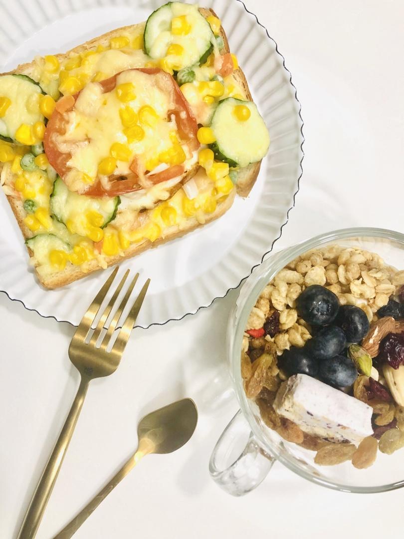 一不小心放的料有点多了🤣,芝士片 火腿 洋葱 煎蛋 黄瓜 番茄 虾仁 玉米青豆胡萝卜,一片就吃到撑🌚
