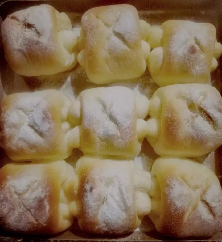 此次做配料擅自改动了点:牛奶135g,鸡蛋1个,酵母4g,165度中层16~18分钟(最好8~10分钟时放锡纸)。(滤镜...