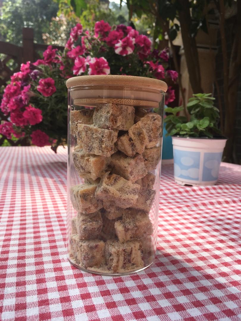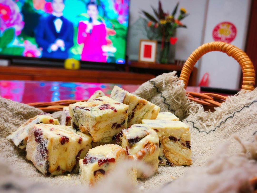 一般的尺寸一口吃不进,奶粉会弄得到处都是,所以切得比较小,一份做了九九八十一块。用的核桃和枸杞,假装很养生。