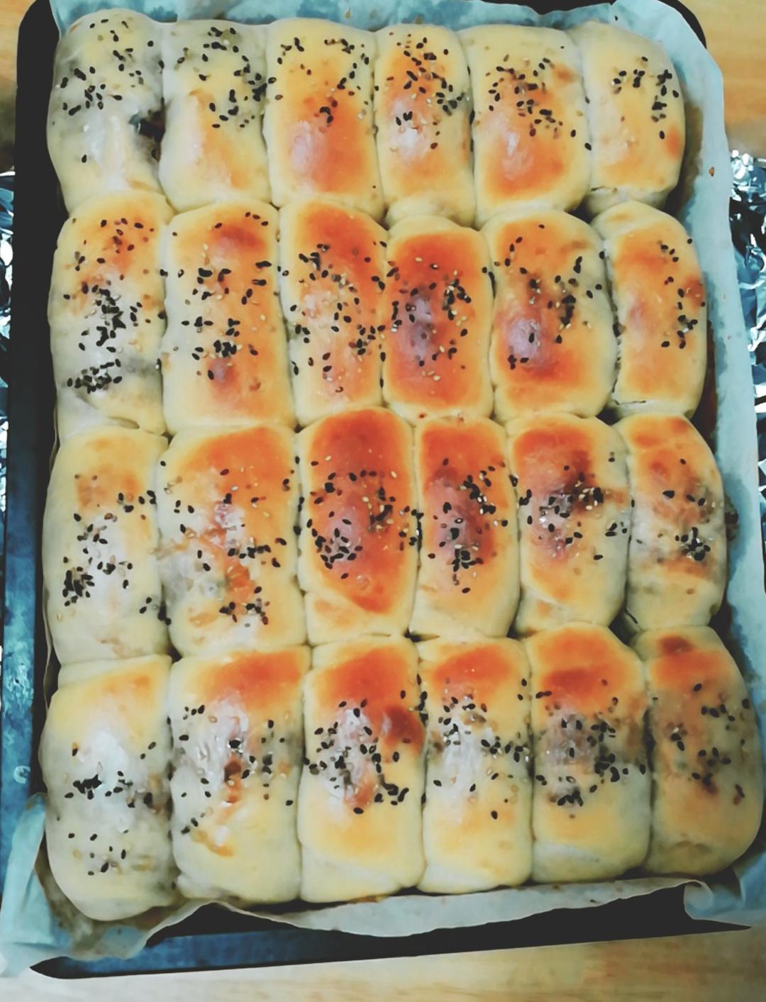 里面卷了椰蓉红豆沙,疫情当前,早晨睡懒觉,起来饭量小,所以面包做很小,够好几天的早餐