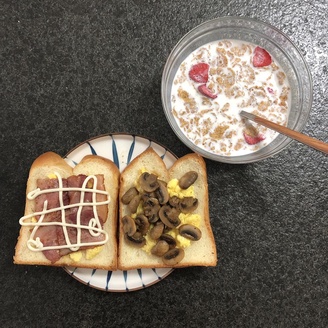早午餐:鸡蛋口菇吐司🍞、鸡蛋培根吐司、健康麦片牛奶