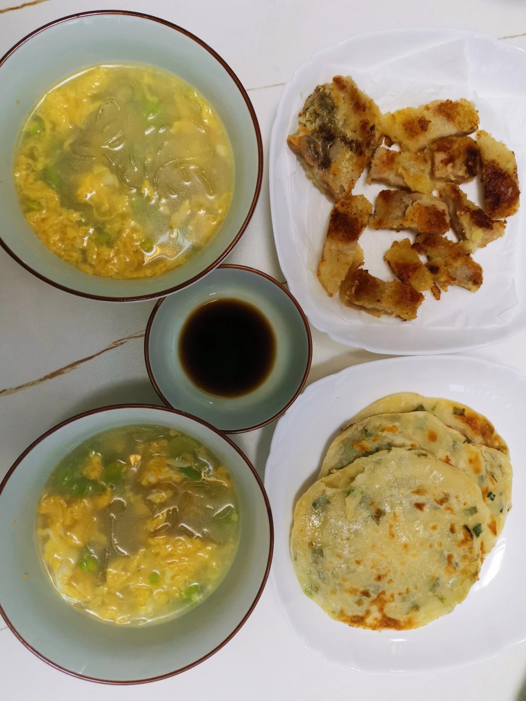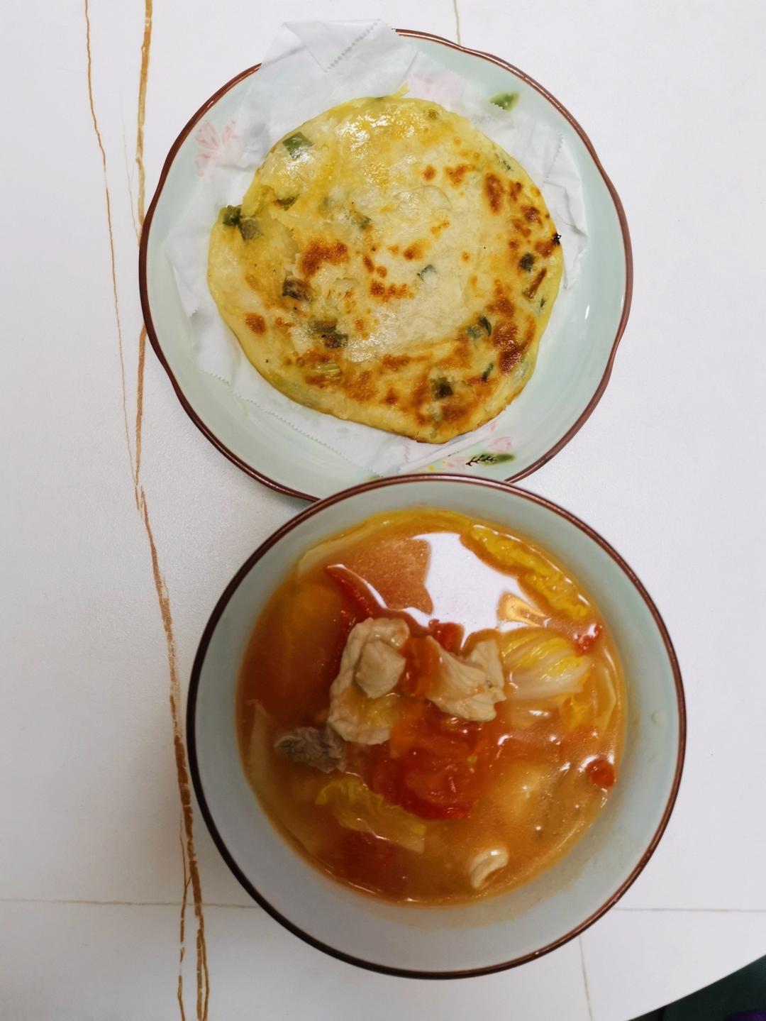 葱油饼、西红柿肉片汤