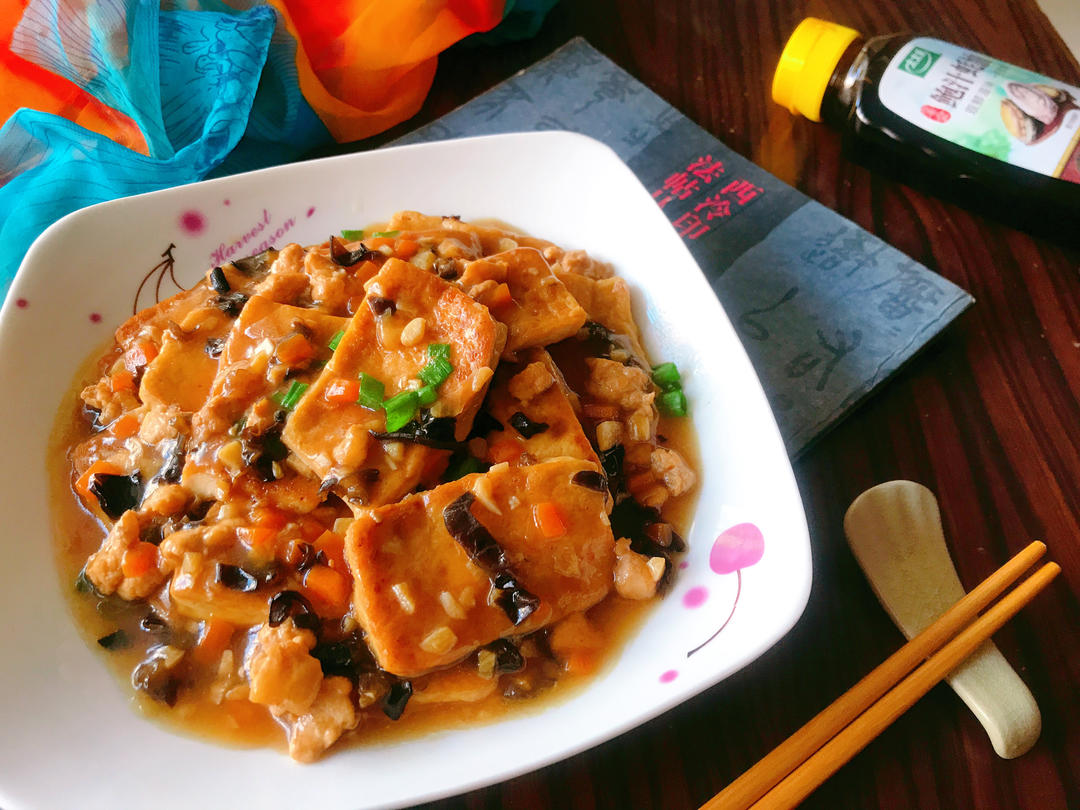 酱烧豆腐;豆腐感觉切的还是有点大了😜配料用家里有的胡萝卜、黑木耳,胡...