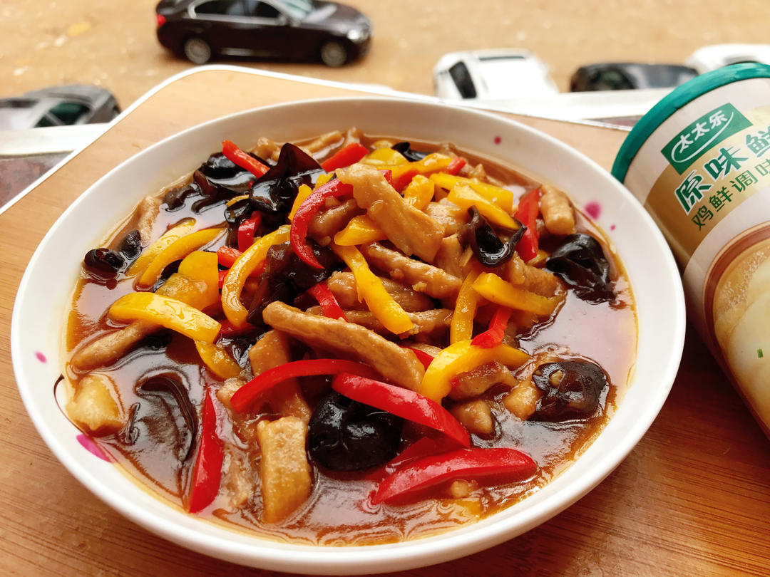 鱼香肉丝选用的是红黄彩椒和黑木耳配肉丝,木耳小就整朵下去了,肉丝还可...