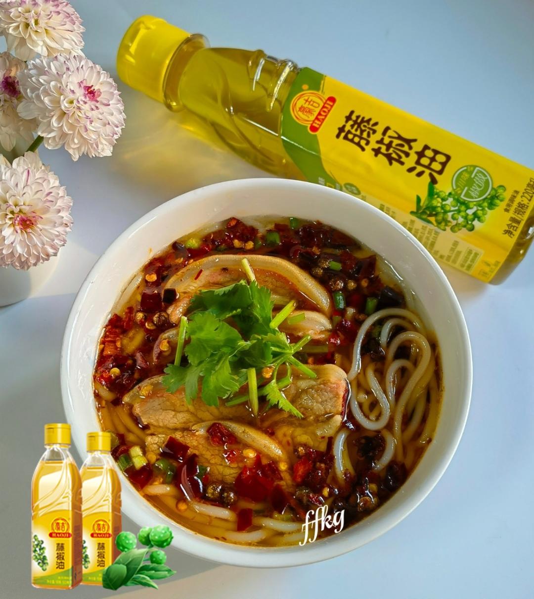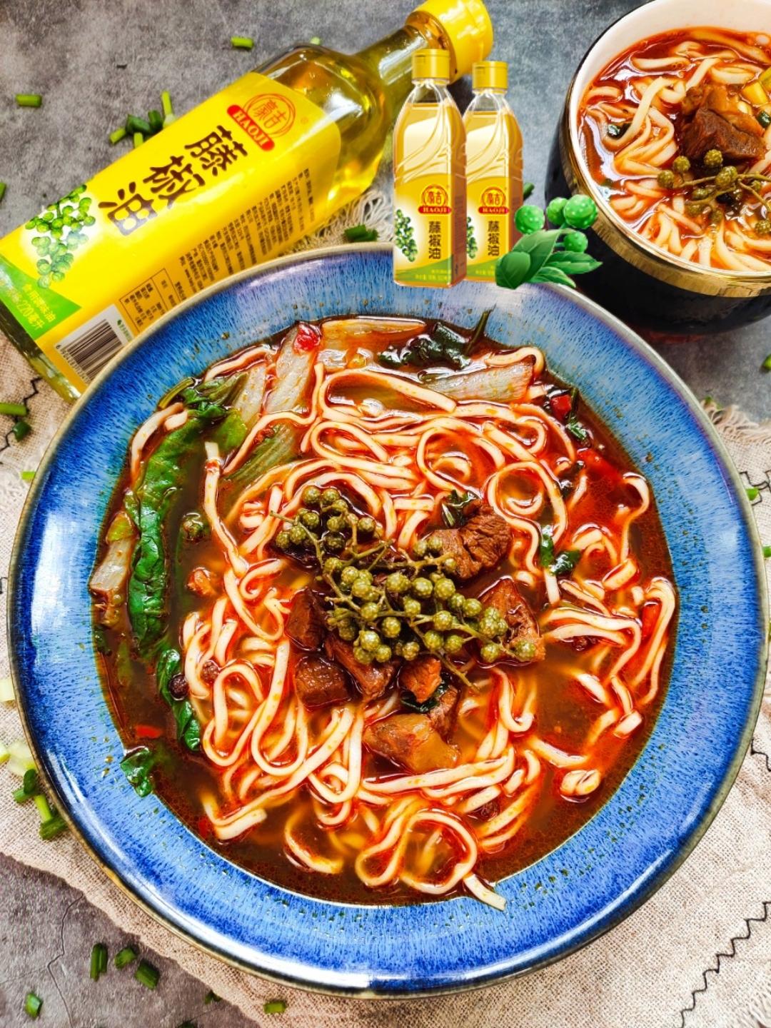 有谁和我一样也非常喜欢藤椒味的吗!加了豪吉藤椒油的藤椒牛肉面,麻爽鲜香的牛腩,再吸溜一口劲...