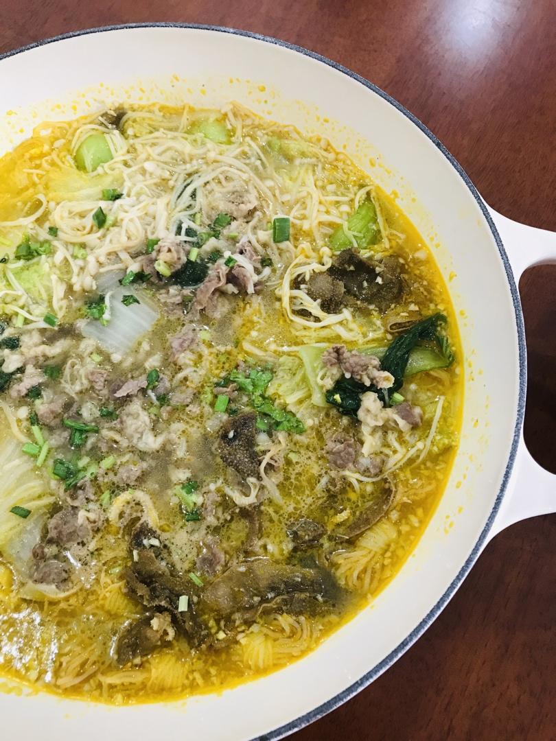 家乐的调料包味道不错,加了肥牛、毛肚、牛百叶、金针菇、大白菜……一大锅全吃光光了