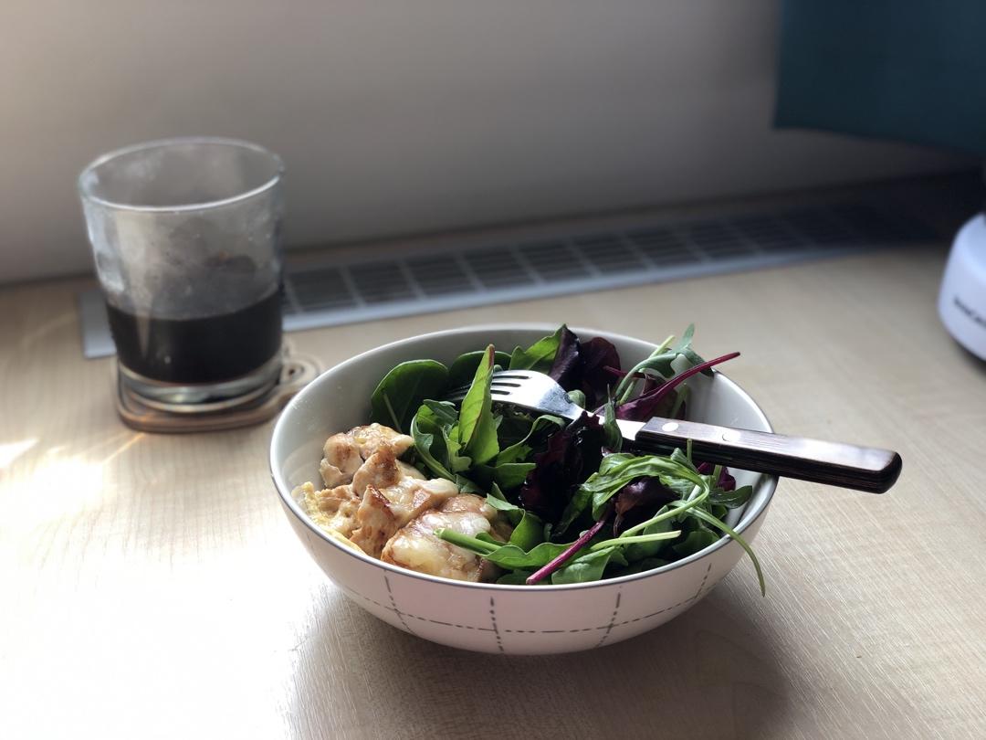 芝士鸡胸肉还是蛮好吃的。晚上怕吃的太冷作死加热了下沙拉,缩成一小坨😅
