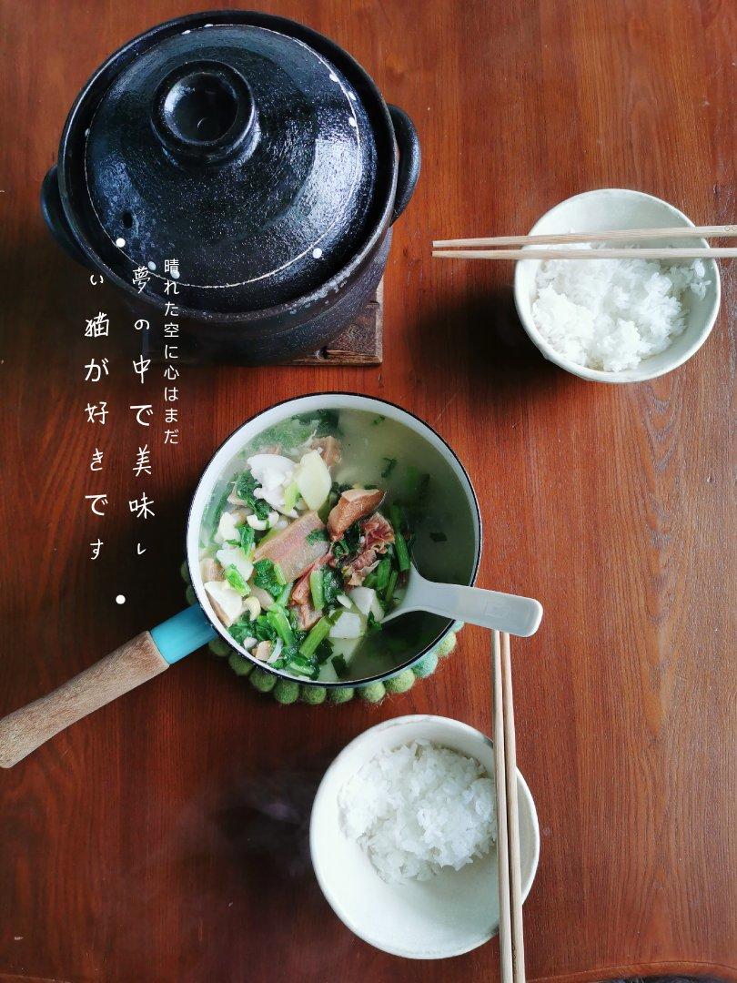和娃午餐,米饭8分钟焖烧关火用余热收干水分,芋头切厚片煮,再加春笋和土豆...