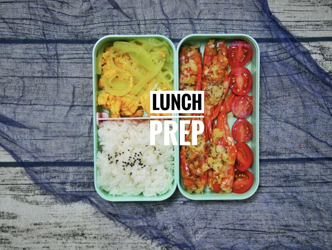 莴笋炒蛋+白饭+蒜泥黄油焗虾