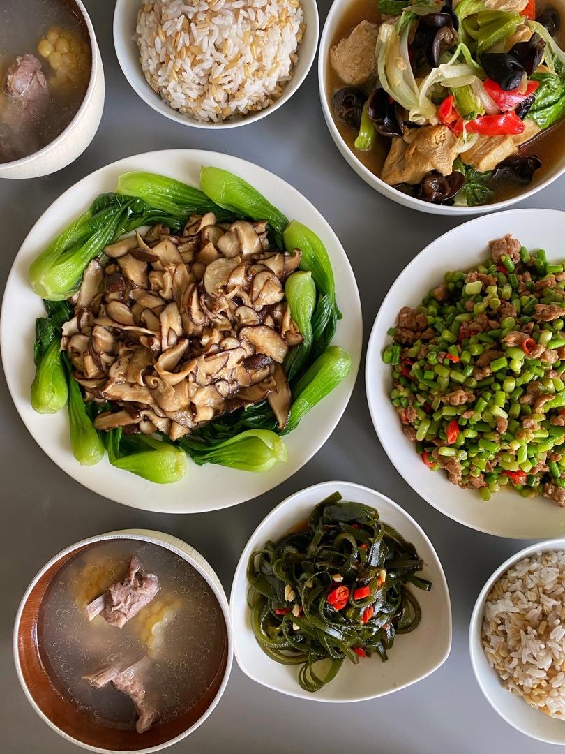肉末蒜苔💚排骨玉米汤🌽杂粮饭🍚