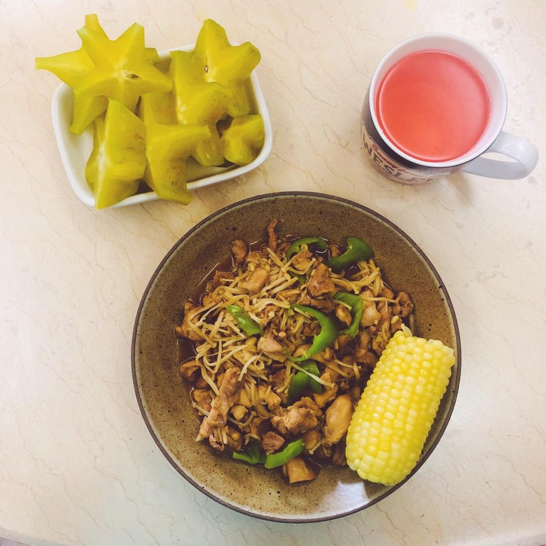 鸡腿肉炒金针菇:两个鸡腿去皮去骨去油 放入照烧汁 蒜末腌一下 锅内少油 直接煎 放金针菇...