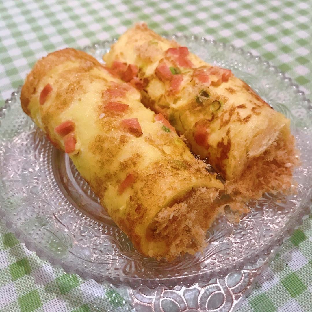 晚上做了芝麻鸡肉松,早上起来,用火腿鸡蛋葱花和肉松,给儿子做了肉松吐司卷。味道太棒了!儿子很喜欢!#早餐•2020年5月...