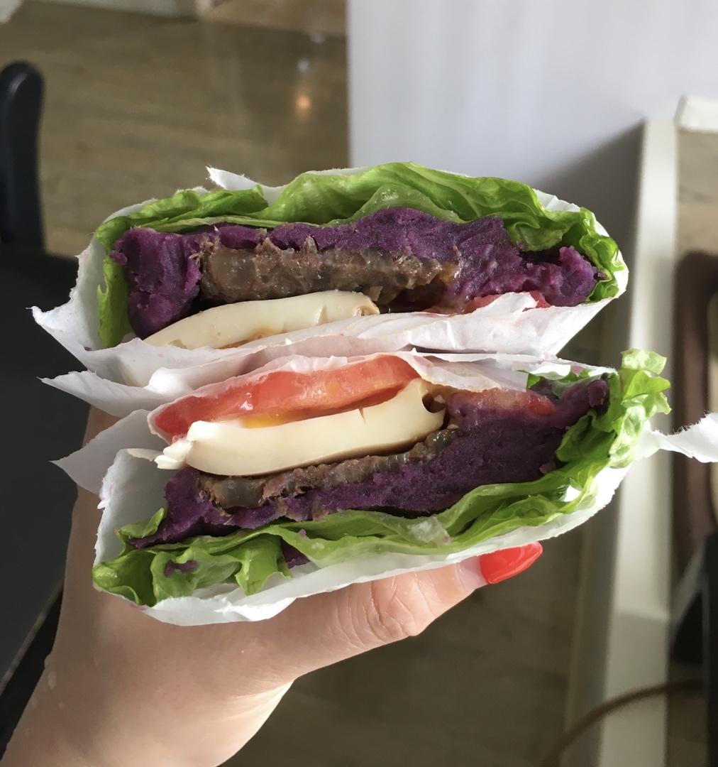 2020-6-10 午餐 紫薯生菜三明治:紫薯140克 148千卡、生菜45克 7千卡、卤蛋一个 89千卡、卤牛肉40克...