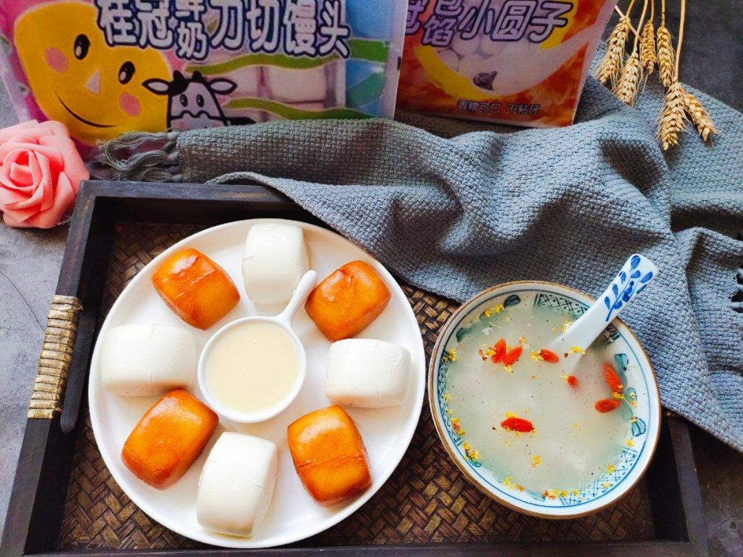 今日花式中式传统早点 : 桂冠炼乳金银小馒头、桂冠包馅小圆子。把炸至的桂冠鲜奶刀切...