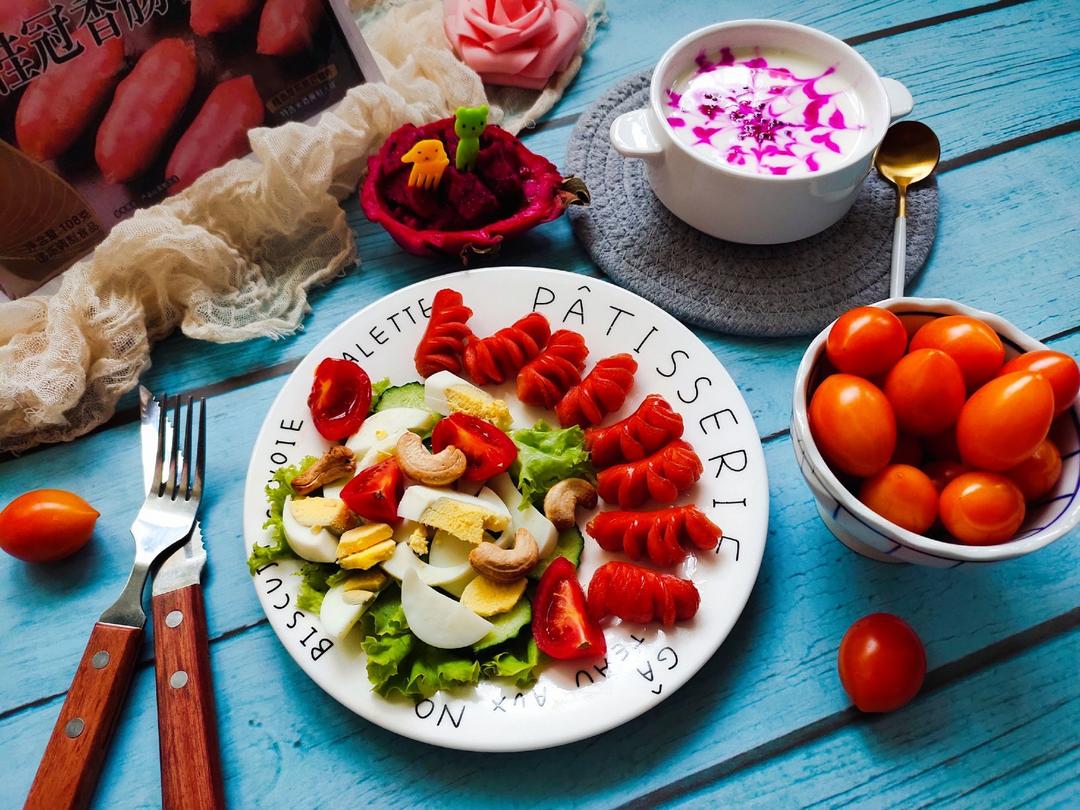 今日花式早餐 : 桂冠香肠蔬菜沙拉、火龙果酸奶拉花、有机黄皮圣女果!