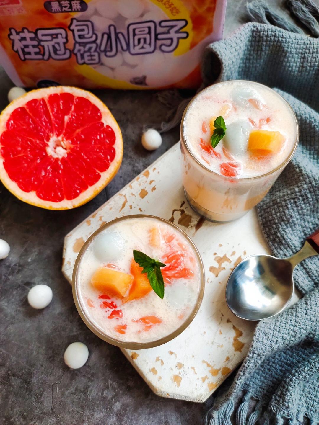 香浓细腻的芒果泥为基地,加入软糯Q弹的桂冠小圆子,再点缀些酸酸甜甜的西柚果肉,香浓...