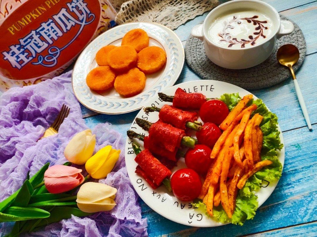 今日花式早餐 : 桂冠南瓜饼、香煎芦笋培根卷、巧克力酱酸奶拉花!晨起后补充能量的早...
