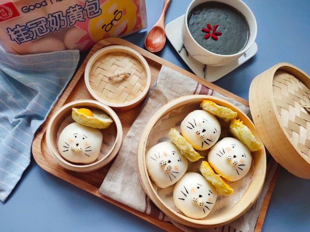 今日花式中式传统早点 : 桂冠小海豹奶黄包、黑芝麻糊。一顿丰富又可爱的早餐,在家也...