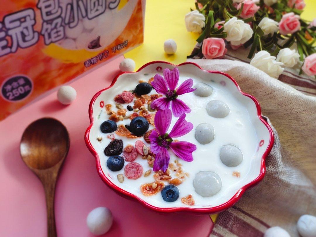 水果配酸奶,再加上煮熟的桂冠包馅黑芝麻小圆子,无比美味,味道颜值双在线,糯米的软绵...