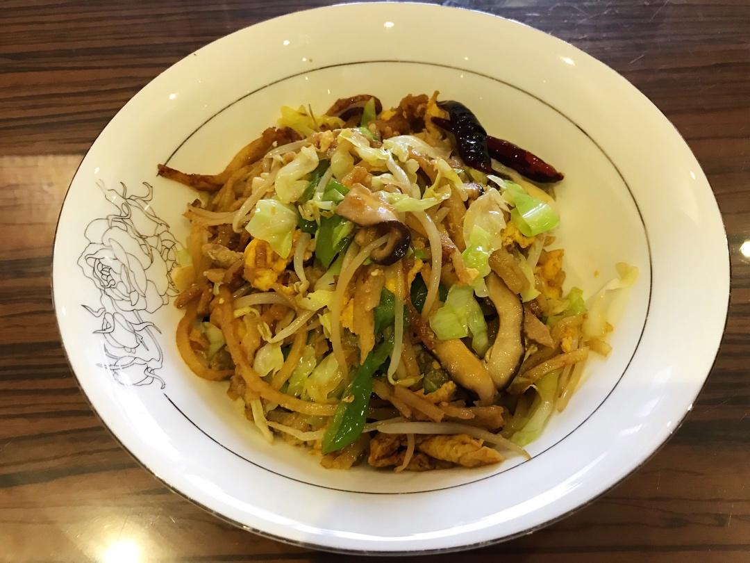 炒饼丝,一人一碗。夏天吃这个比较简单,不容易出汗😄