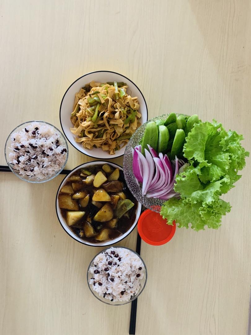 晚餐菜单:地三鲜、尖椒炒豆皮、蘸酱菜、红豆饭