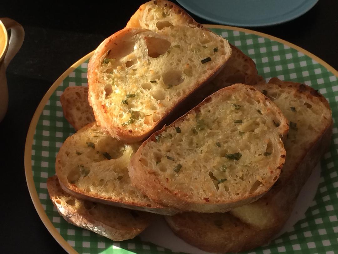 用掉最后一点蒜蓉黄油~切了一条那种烤面包,类似法滚但是是短胖的橄榄形那种,商品名说是意大利面包,反正就是那个操作吧。#早...