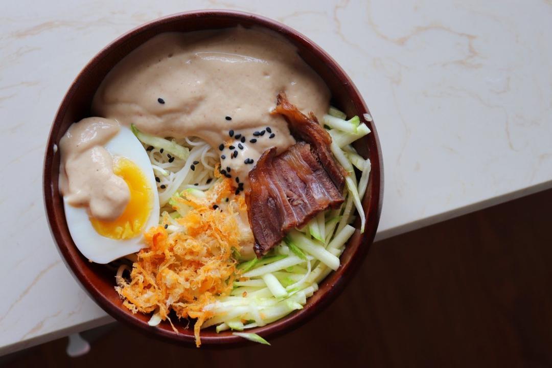 特别是当紫菜金针菇酱汁滴在溏心蛋上