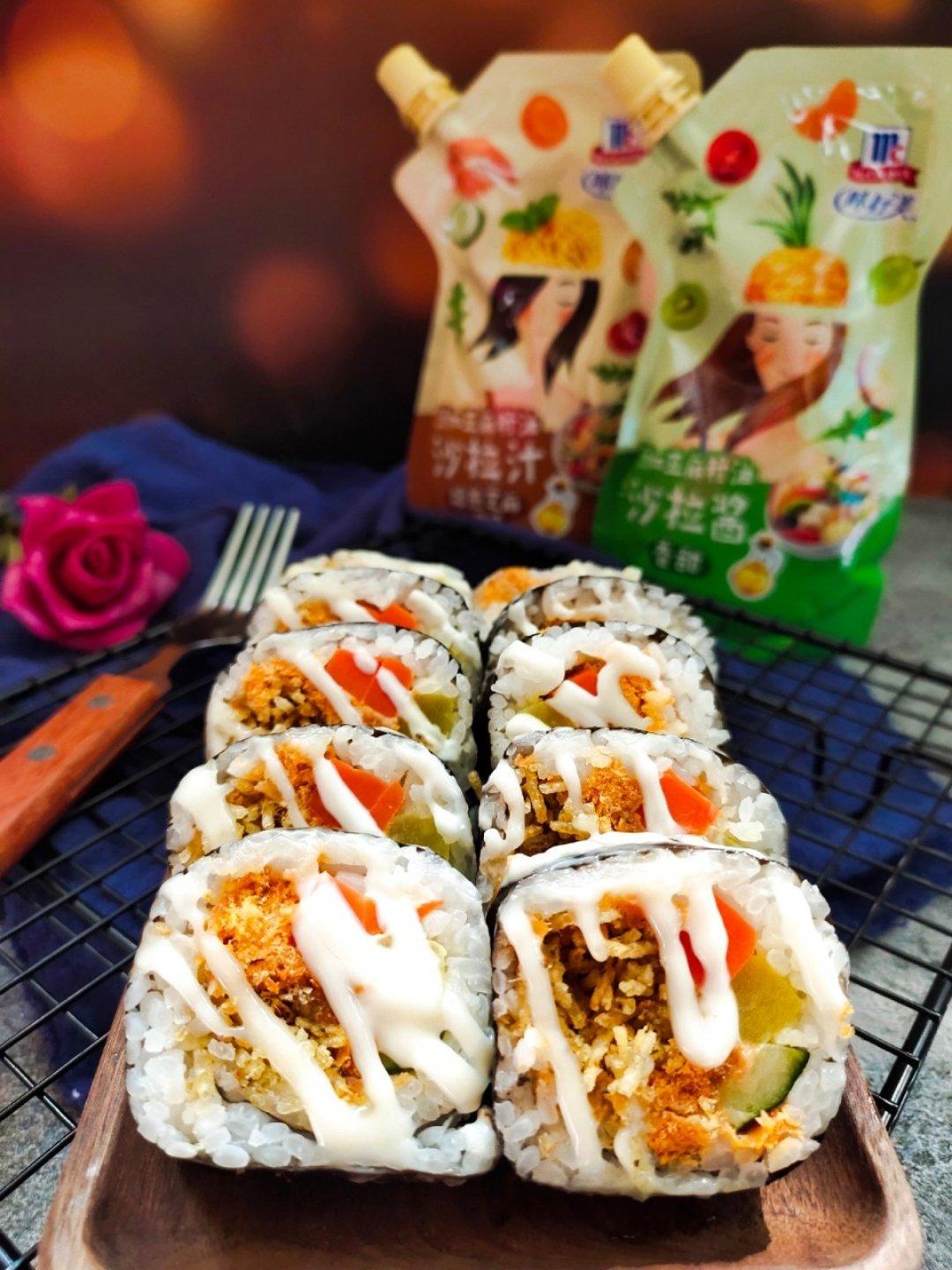 把卷好的肉松海苔寿司卷上淋上味好美亚麻籽香甜味的沙拉酱,每一口都是幸福的味道,美好的一天就从现在开始...