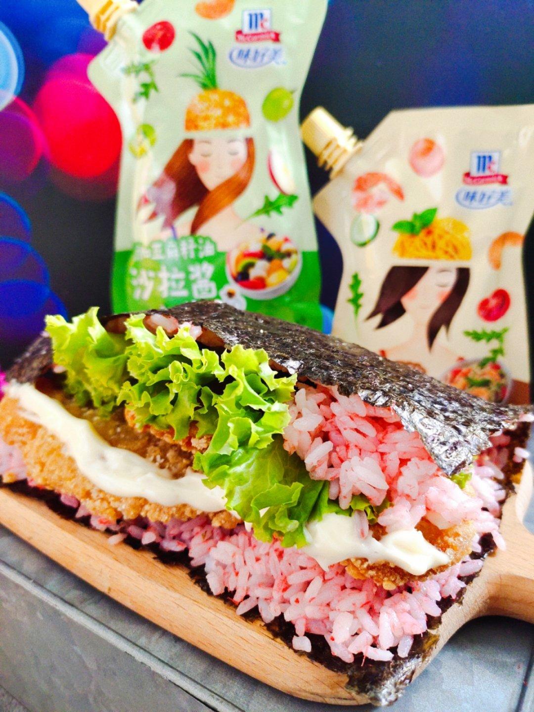 粉嫩嫩的鱼松粉,还有鲜美海苔,香酥美味的炸鸡排,搭配味好美香甜味的沙拉酱...
