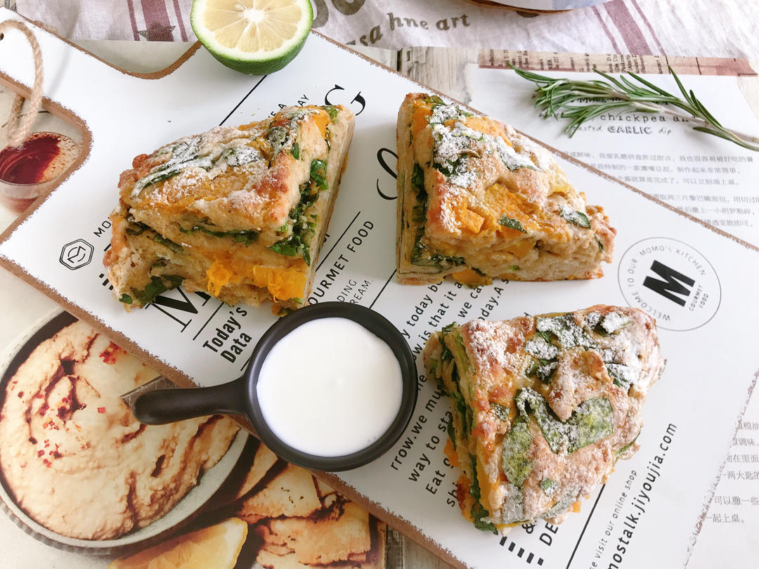 用20%全麦粉替换了等量高粉,丝毫不影响口感,南瓜香甜绵蜜,孜然粉增加了风味,奶酪用了...