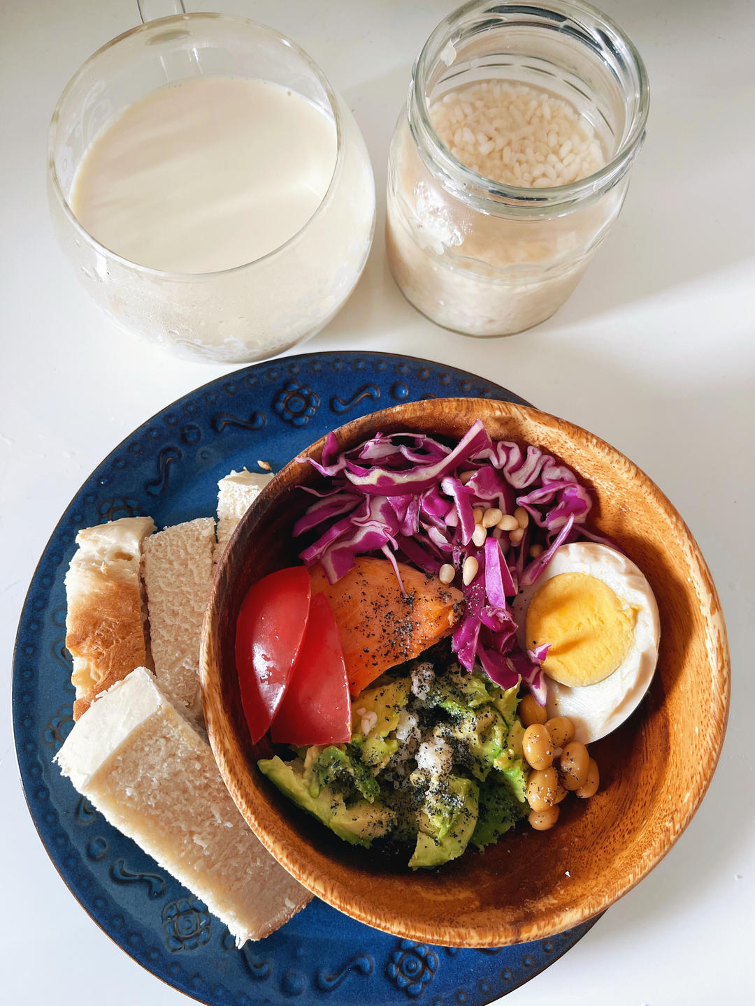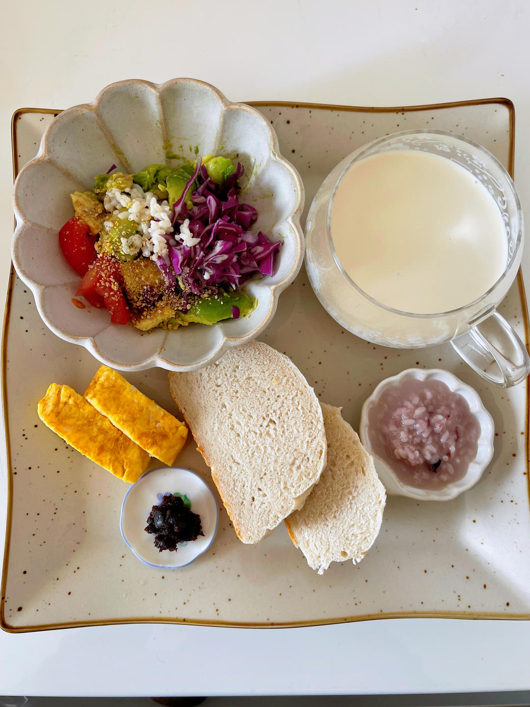 早安!今日发酵早餐,牛油果🥑盐曲沙拉,盐曲鸡蛋卷,豆浆➕发酵甘酒,自制面包,鉴真大师的招提味增,这是千年前大唐的味道🙏合...