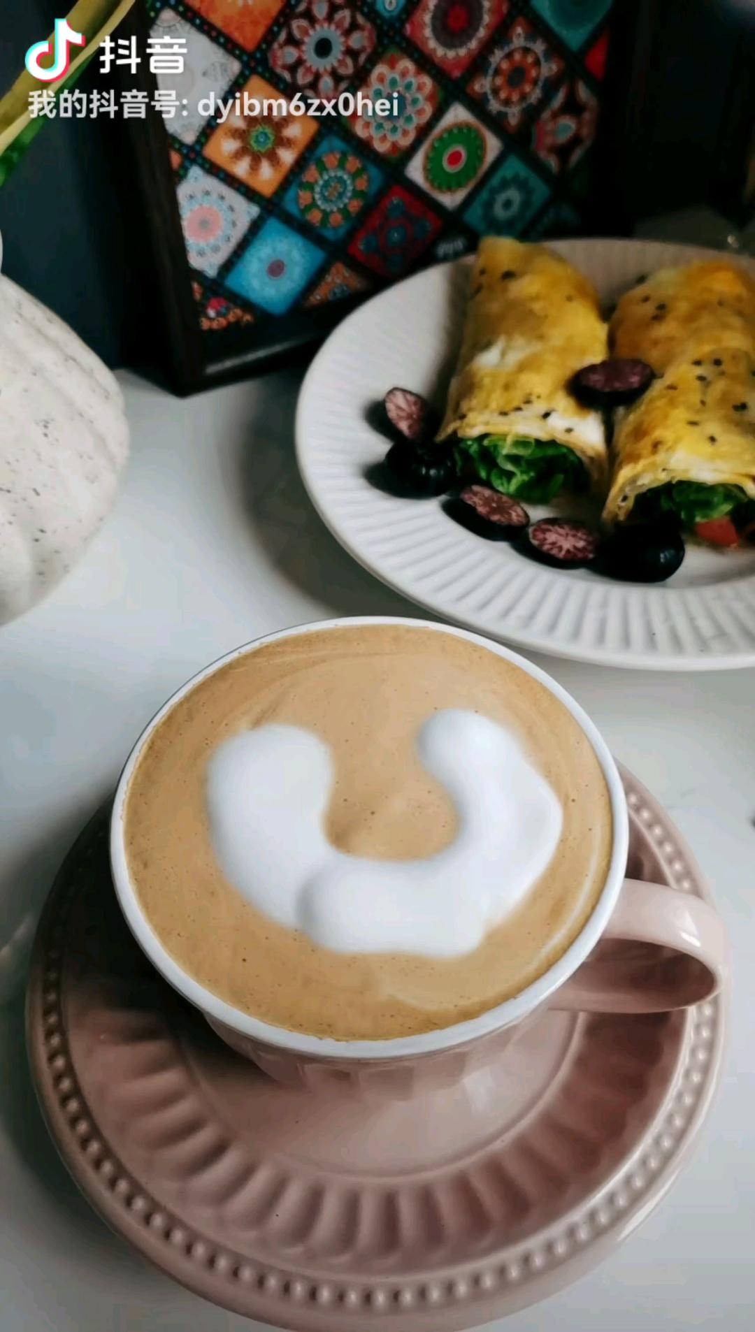 美美的早餐来了:包菜蛋饼三明治,玫瑰拉花拿铁咖啡