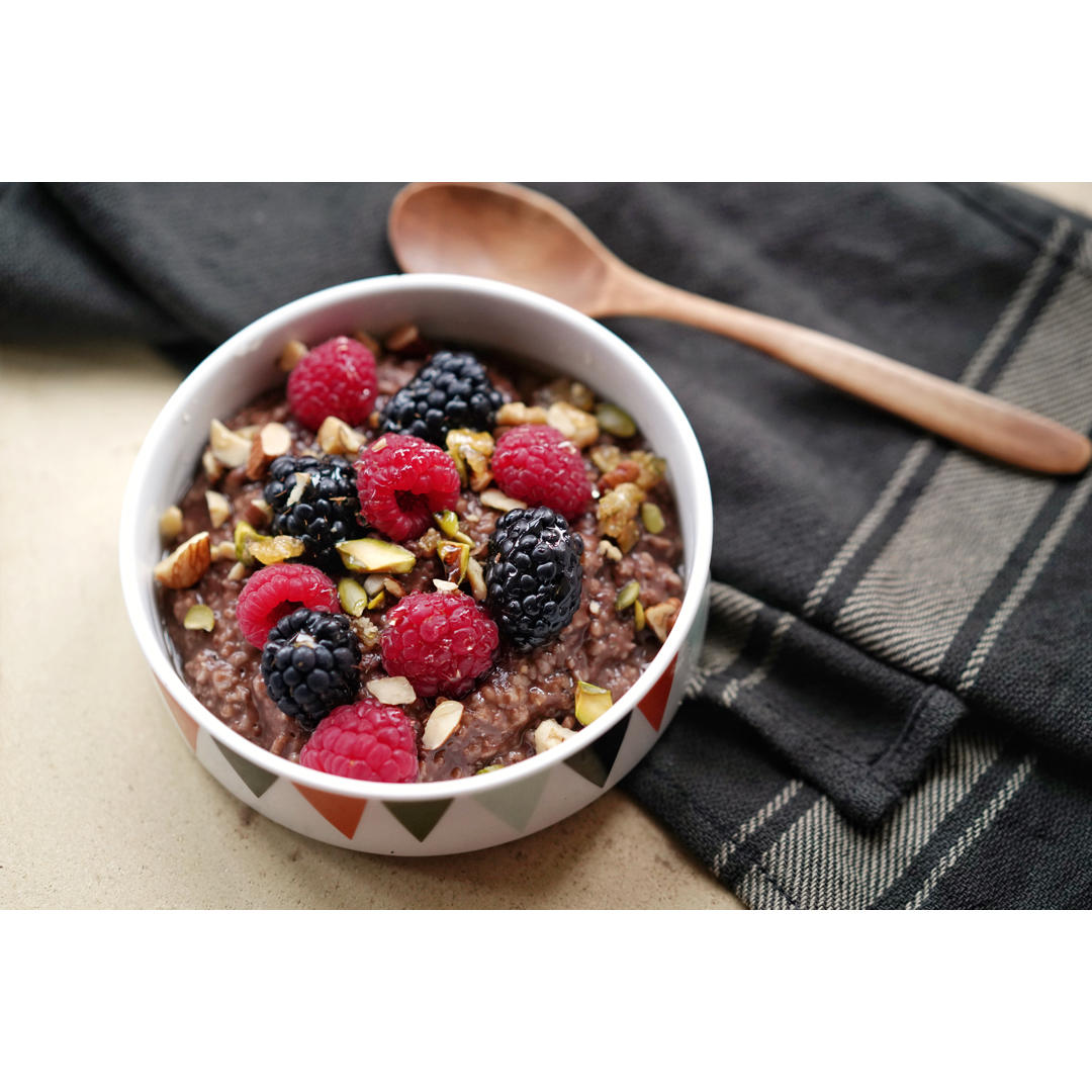 在ole買到很好吃的黑莓,用可可粉煮燕麥做基地,蜂蜜一勺做甜味。