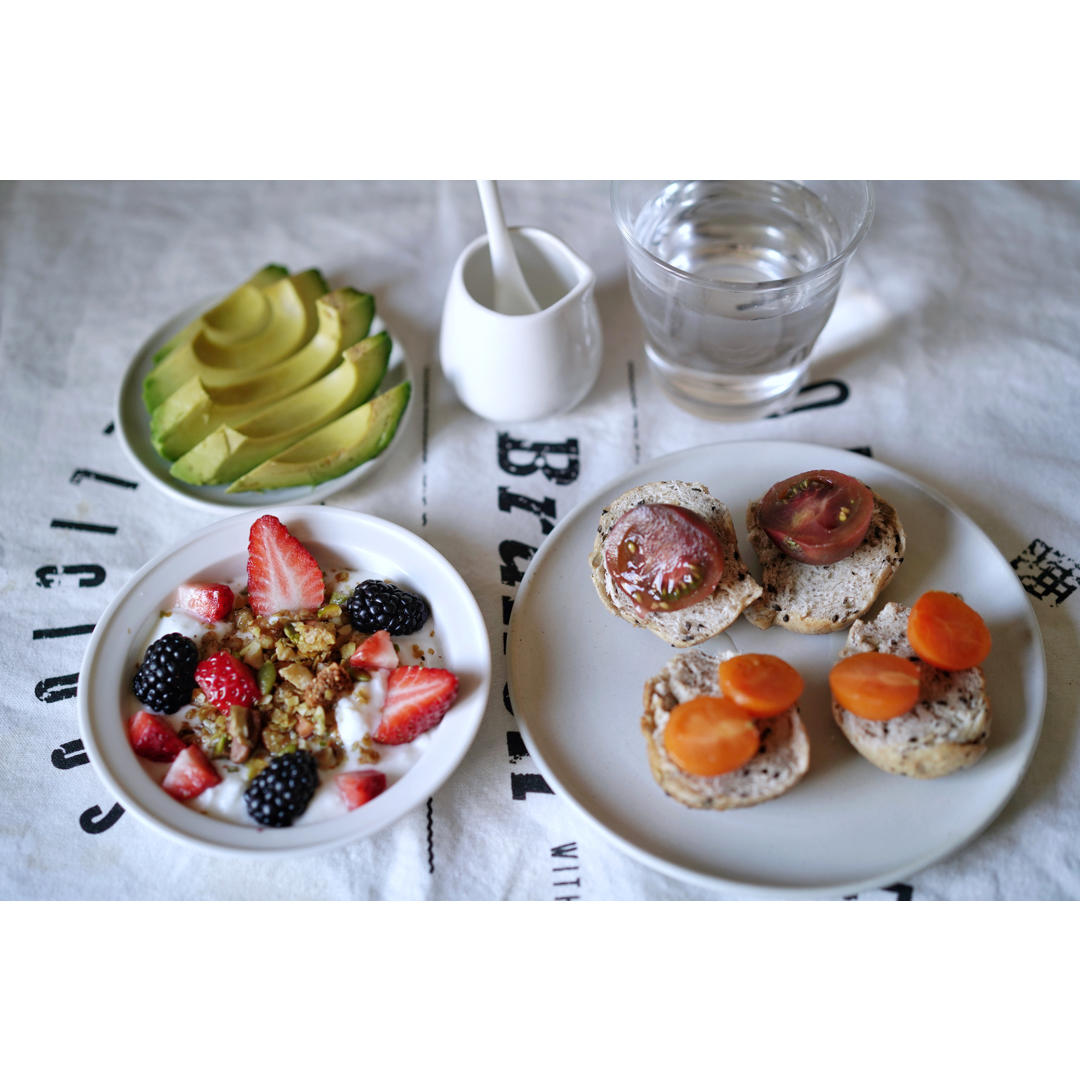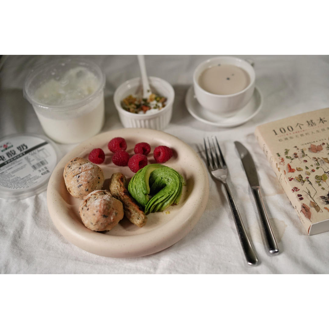 酸奶、奶茶佐無油餐包、牛油果、樹莓