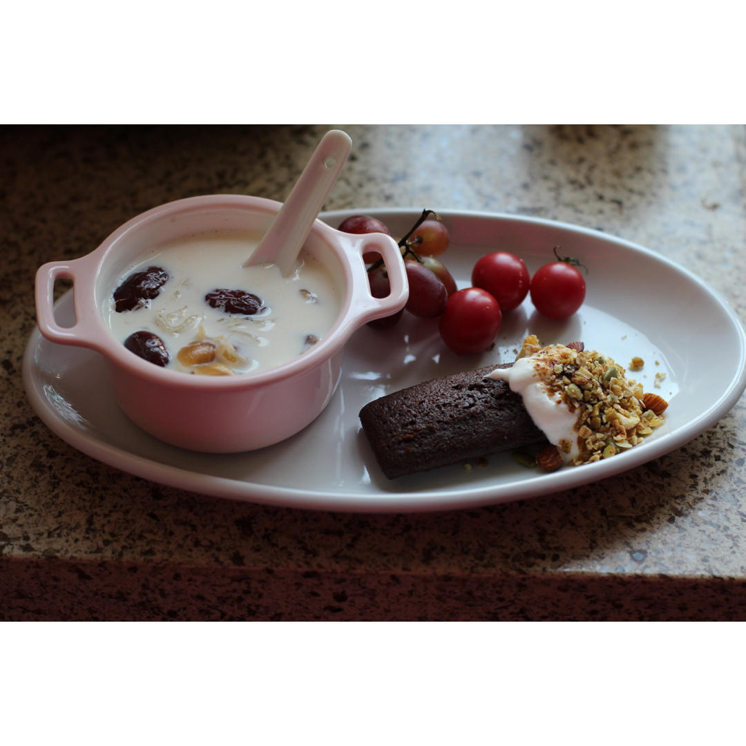 紅棗桂圓牛奶燕窩佐可可費德林、堅果酸奶
