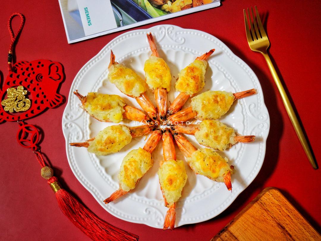今日分享年夜菜-花开富贵芝士焗大虾!造型大气美好,寓意吉祥如意!芝士,土豆泥和鲜虾融合在一起,鲜香十足,好看又好吃~