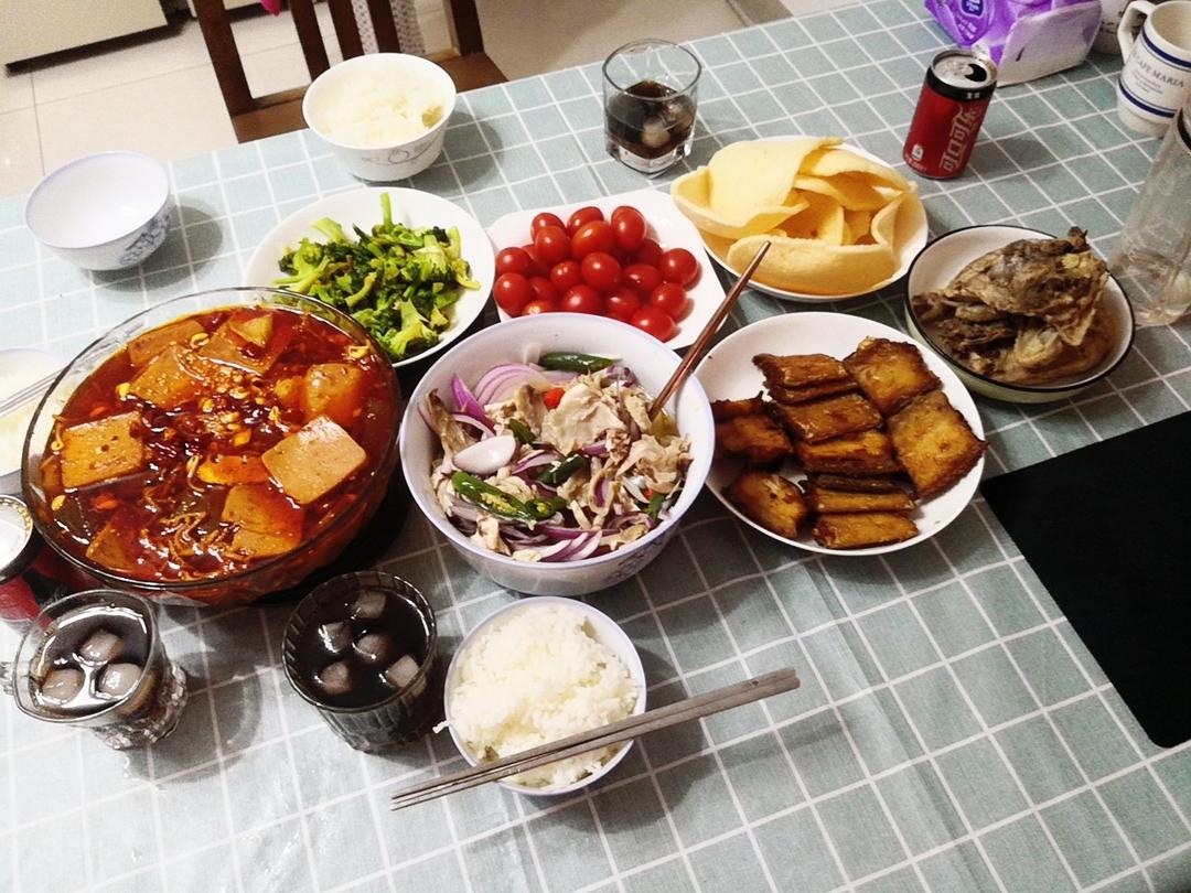 我贡献了两个硬菜,毛血旺和椒麻鸡,妈妈炸了带鱼、虾片,炒了西蓝花,再加上买的佛跳墙、提拉米苏,太丰盛了!...