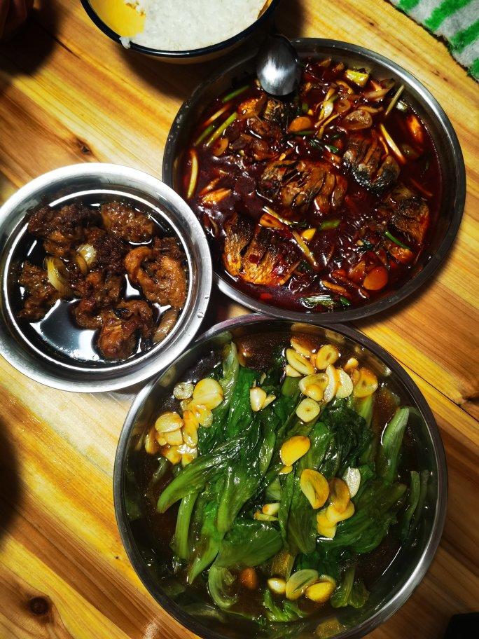 红烧鲫鱼,蚝油生菜,蒸鸡块,荤素搭配,营养美味