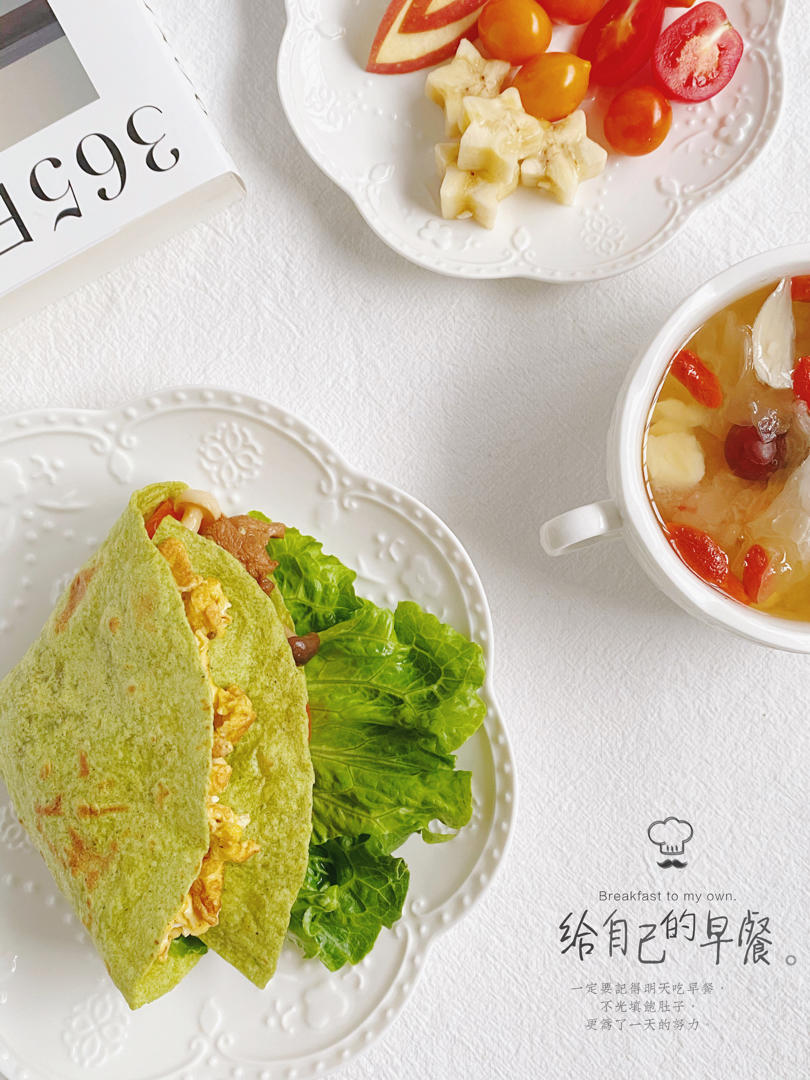 鸡蛋牛肉蔬菜卷饼➕银耳莲子红枣汤➕水果