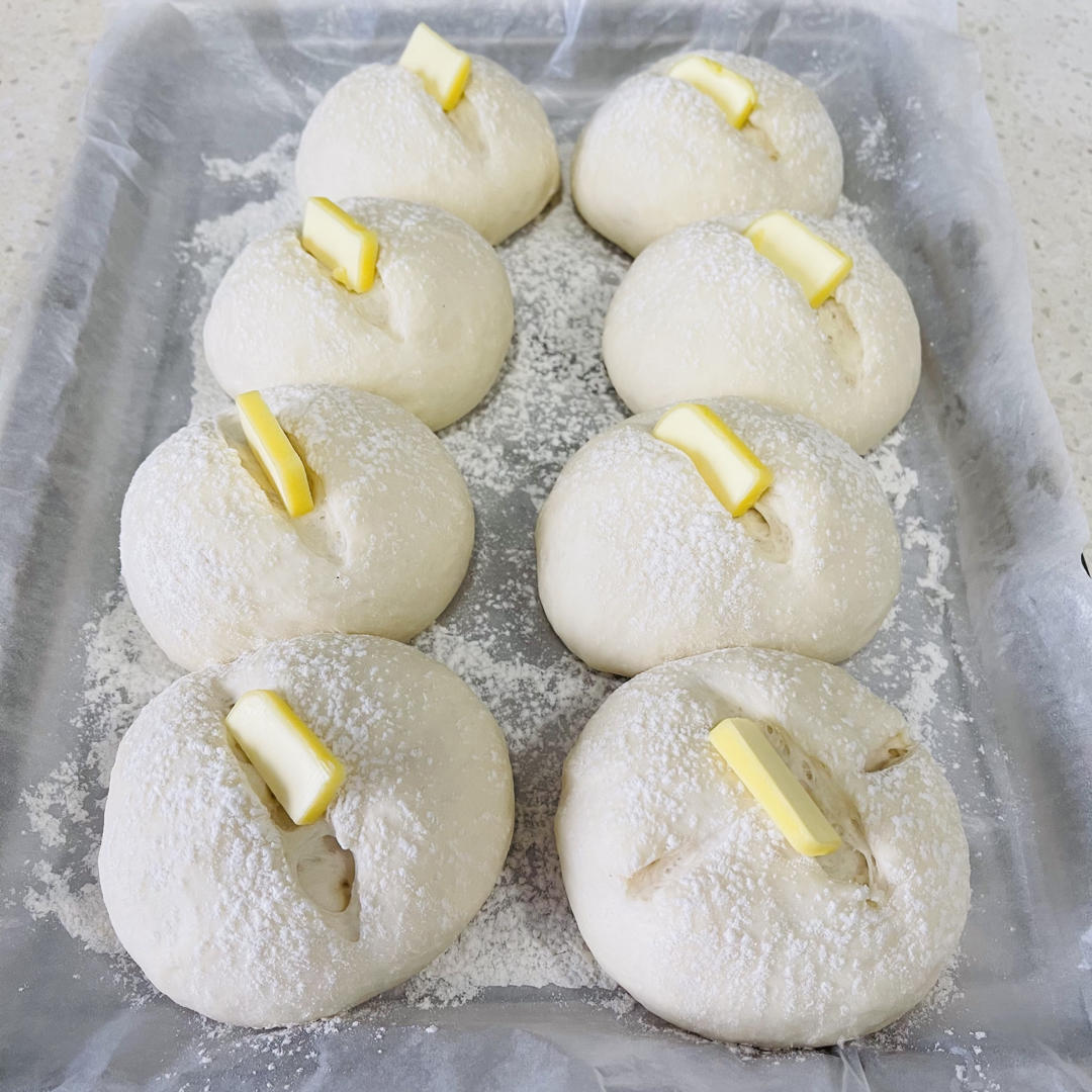 高筋面粉250克,水150克,盐4克,糖7克,干酵母3克,橄榄油12.5克,割口用黄油10克
